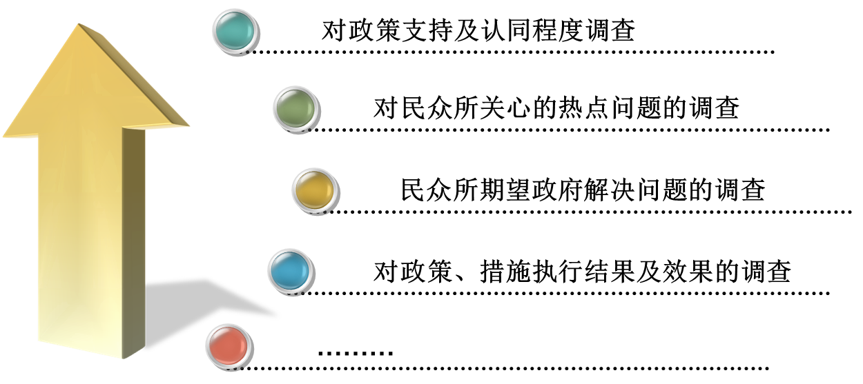 ü 政策制定前期調(diào)研是一項匯民意、聚民智的調(diào)研,能夠使得制定的政策更加貼近民意,進而惠及民眾,同時也能夠增強政府與民眾之間的溝通,體現(xiàn)政府以民眾為本的服務思想。