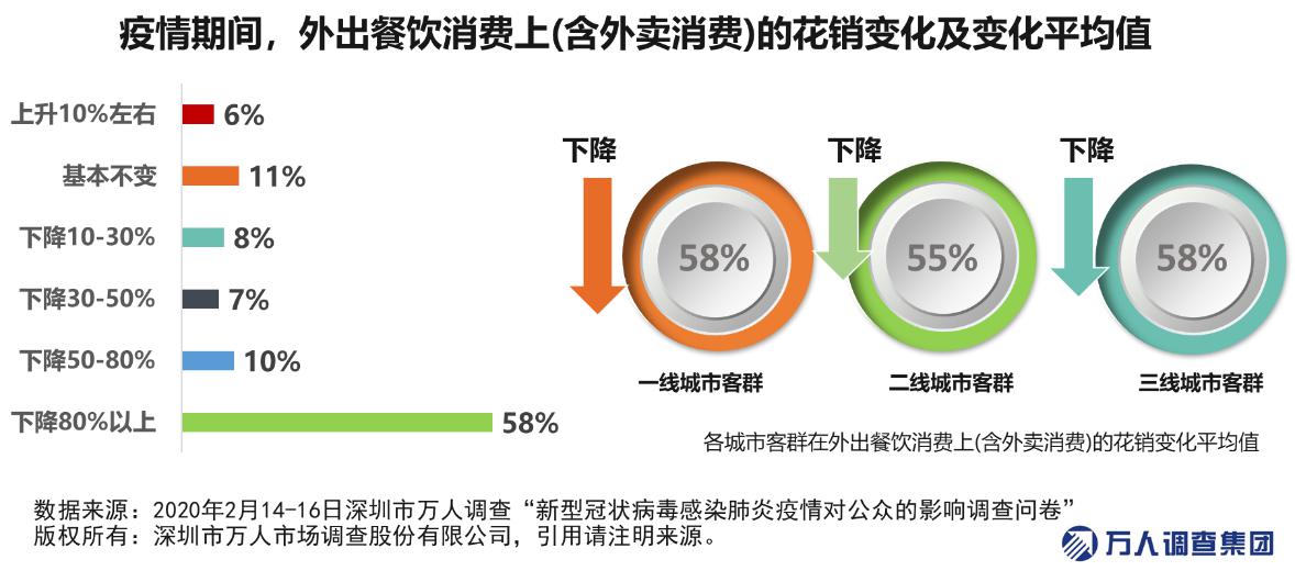 數(shù)據(jù)顯示,近六成市民表示疫情期間外出餐飲支出下降超過(guò)80%。整體來(lái)看,一二三線城市的市民在餐飲(含外賣)花銷的降幅較為一致,平均下降比例均在55%-58%之間。