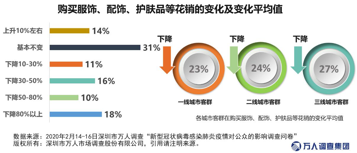服飾和化妝品方面,很多品牌關(guān)閉了中國(guó)內(nèi)地部分門(mén)店以減少成本,并逐步將重心轉(zhuǎn)至線上。數(shù)據(jù)顯示,由于服飾和化妝品仍可從線上渠道購(gòu)買,31%的市民表示支出整體維持不變,但是由于快遞停運(yùn)、物流周期過(guò)長(zhǎng)等原因,整體購(gòu)物體驗(yàn)并不好,55%的市民表示支出有所下降,其中下降超過(guò)80%的占比達(dá)到18%。