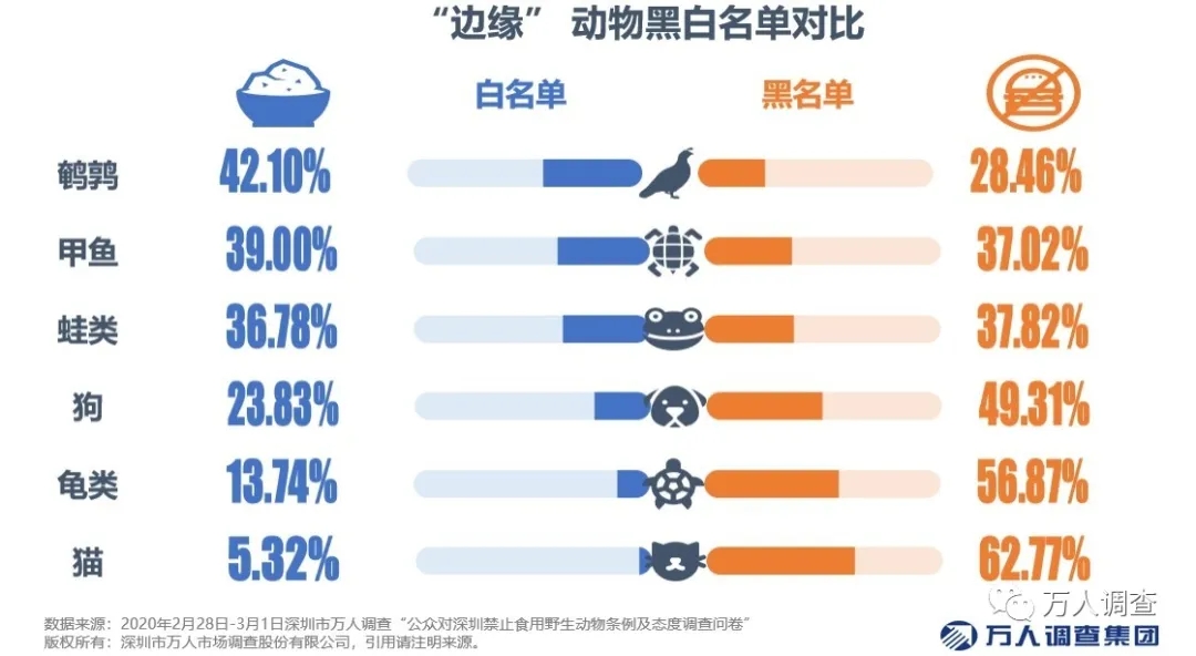 在《征求意見稿》中不但給出了禁食的動(dòng)物“黑名單”,還明確列出了可以食用的動(dòng)物“白名單”,其中包括豬、牛、羊、驢、兔、雞、鴨、鵝、鴿等。但對(duì)于那些已被廣泛食用的養(yǎng)殖類動(dòng)物(如蛙類、甲魚、鵪鶉等)來說,公眾對(duì)其是否應(yīng)該加入“白名單”之列略有爭(zhēng)議。調(diào)查數(shù)據(jù)顯示,對(duì)于鵪鶉和甲魚,公眾支持列入“白名單”比例高于列入“黑名單”;對(duì)于“蛙類”而言,公眾支持列入“黑名單”比例略高于列入“白名單”;對(duì)于“狗、龜類、貓”等動(dòng)物來說,更多的公眾認(rèn)為應(yīng)該列入禁食“黑名單”中。