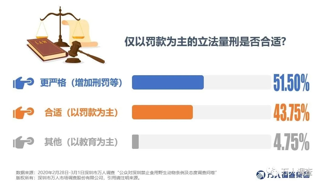 在《征求意見稿》中對(duì)于食用、生產(chǎn)經(jīng)營(yíng)及飼養(yǎng)野生動(dòng)物的違法行為的量刑僅以罰款為主,公眾如何看待呢?調(diào)查數(shù)據(jù)顯示,公眾認(rèn)為立法中的量刑應(yīng)該更嚴(yán)格(如增加刑罰等)的比例較高,為51.50%;其次是認(rèn)為此量刑合適,比例為43.75%;而認(rèn)為應(yīng)該采用其他量刑方式(如以教育為主)的比例較低,僅為4.75%。可見,大多數(shù)公眾希望在征求意見稿的量刑基礎(chǔ)上適當(dāng)加入明確的刑事處罰。