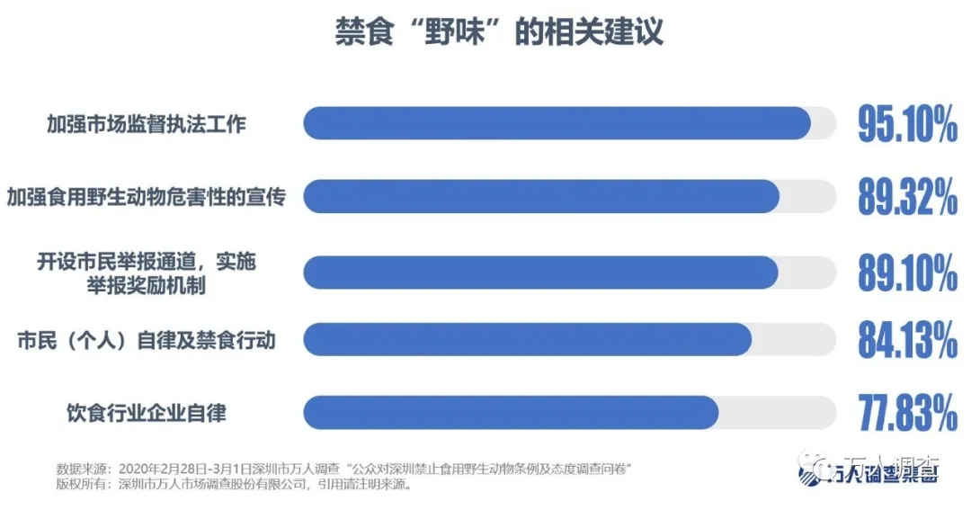 一是加強(qiáng)禁食“野味”的法律法規(guī)宣傳教育力度,利用標(biāo)語、宣傳畫、宣傳單、視頻等多樣化手段,通過電視、廣播、報(bào)刊、網(wǎng)絡(luò)等媒介廣泛宣傳,推動(dòng)全面積極參與法律法規(guī)學(xué)習(xí)活動(dòng),提高守法意識(shí);二是在普法宣傳的基礎(chǔ)上,可廣泛邀請(qǐng)廣大市民、社會(huì)各界代表參與執(zhí)法監(jiān)督,讓法治精神深入人心。三是對(duì)于違法食用野生動(dòng)物條例的行為懲治,可通過電視、廣播、報(bào)紙、網(wǎng)絡(luò)等各類媒介進(jìn)行相關(guān)報(bào)道,讓市民心存敬畏、遵守法令。 立法只是禁野運(yùn)動(dòng)好的開始,立法后還有很多工作需要進(jìn)一步完善,監(jiān)管是否能持續(xù)有效、產(chǎn)業(yè)是否被成功替代、運(yùn)動(dòng)熱潮過后是否會(huì)反彈等一系列問題,都值得全社會(huì)去思考、去改變。我們有理由相信,只要敬畏自然、敬畏生命、敬畏法律,禁野運(yùn)動(dòng)會(huì)取到圓滿的結(jié)果! 如需獲取全文或更多信息請(qǐng)聯(lián)系:曾先生:15019238175、zgc@wanren.com版權(quán)所有:深圳市萬人市場(chǎng)調(diào)查股份有限公司,如需轉(zhuǎn)載請(qǐng)注明數(shù)據(jù)來源。感謝您參與“公眾對(duì)深圳禁止食用野生動(dòng)物條例的認(rèn)知及態(tài)度”調(diào)查活動(dòng)!公司已通過抽獎(jiǎng)系統(tǒng)抽取了本次活動(dòng)的20名中獎(jiǎng)?wù)?,現(xiàn)將中獎(jiǎng)名單公布如下: