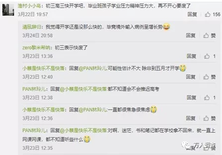 從是否面臨升學(xué)考試的學(xué)生家長群體對復(fù)學(xué)的態(tài)度來看,面臨升學(xué)考試的家長群體中,希望盡早復(fù)學(xué)的比例達到了81.58%,高出非升學(xué)考試家長群體近10個百分點。正如網(wǎng)友評論所說,初三高三再不復(fù)學(xué)表示很焦慮: