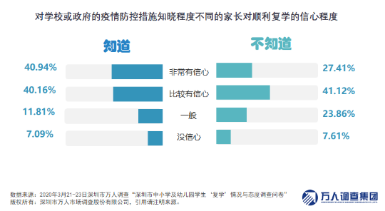 為做好線下復(fù)學(xué),近期學(xué)?;蛘嚓P(guān)部門都在陸續(xù)開展相關(guān)的復(fù)學(xué)前疫情防控準(zhǔn)備工作。本次調(diào)查中有56.32%的家長表示知曉目前學(xué)校正在開展相關(guān)準(zhǔn)備工作,在這部分知曉的家長群體中,對順利復(fù)學(xué)有信心的占比達到了81.20%;而對學(xué)校相關(guān)準(zhǔn)備工作不了解的家長群體中,表示對順利復(fù)學(xué)有信心的為68.53%??梢?,及時公布各項復(fù)學(xué)前的疫情防控準(zhǔn)備工作,有利于提高家長群體的復(fù)學(xué)信心,并讓他們“放心”。