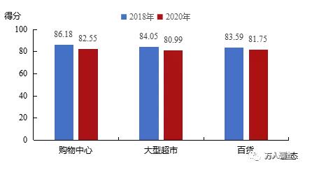 與2018年相比,三類業(yè)態(tài)2020年滿意度得分均有不同程度的下降,其中購物中心降幅較大,下降了3.63分,大型超市和百貨分別下降3.06、1.84分。