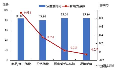 再結合影響力系數(shù)來看,商品/商戶獨特新穎性和商品/商戶種類齊全性影響力系數(shù)均在0.750以上,故提高這兩項指標的顧客滿意度對提升商品/商戶優(yōu)勢的顧客滿意度最為有利。
