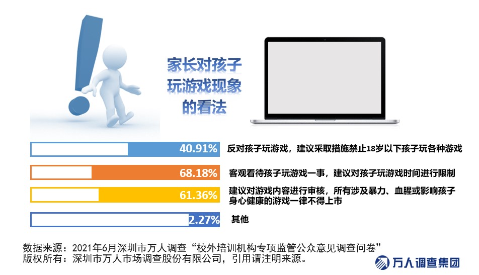 而在看待孩子玩游戲現(xiàn)象方面,有68.18%的家長認(rèn)為需客觀看待孩子玩游戲一事,建議對孩子玩游戲時間進(jìn)行限制;有61.36%的家長希望對游戲內(nèi)容進(jìn)行審核,認(rèn)為所有涉及暴力、血腥或者影響孩子身心健康的游戲一律不得上市;也有40.19%的家長反對孩子玩游戲,建議采取措施禁止18歲以下孩子玩各種游戲。由此可見,大部分家長對孩子玩游戲的看法是相對理性的,認(rèn)為需要游戲運營者給孩子限定時間,限制游戲內(nèi)容,更多的輸出一些益智類的游戲比較好?!?/p>