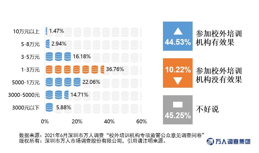 現(xiàn)階段雖然家長清楚孩子是否能夠成才主要靠自己,但在“看別的孩子都報班了”這一氛圍的裹挾下,也只好“被卷入”到這一場無形的競爭中。調(diào)查顯示,57.35%的家長表示每年為孩子參加校外輔導(dǎo)的費用(一個孩子)超過了1萬元,其中花費3萬元以上的有20.59%。對于普通工薪階層家庭而言,這是一筆不小的經(jīng)濟(jì)負(fù)擔(dān)。但從培訓(xùn)效果來看,45.26%的家長對參加校外培訓(xùn)班是否有成效持保守的態(tài)度,認(rèn)為不好說,也有10.22%的家長明確表示沒有效果。