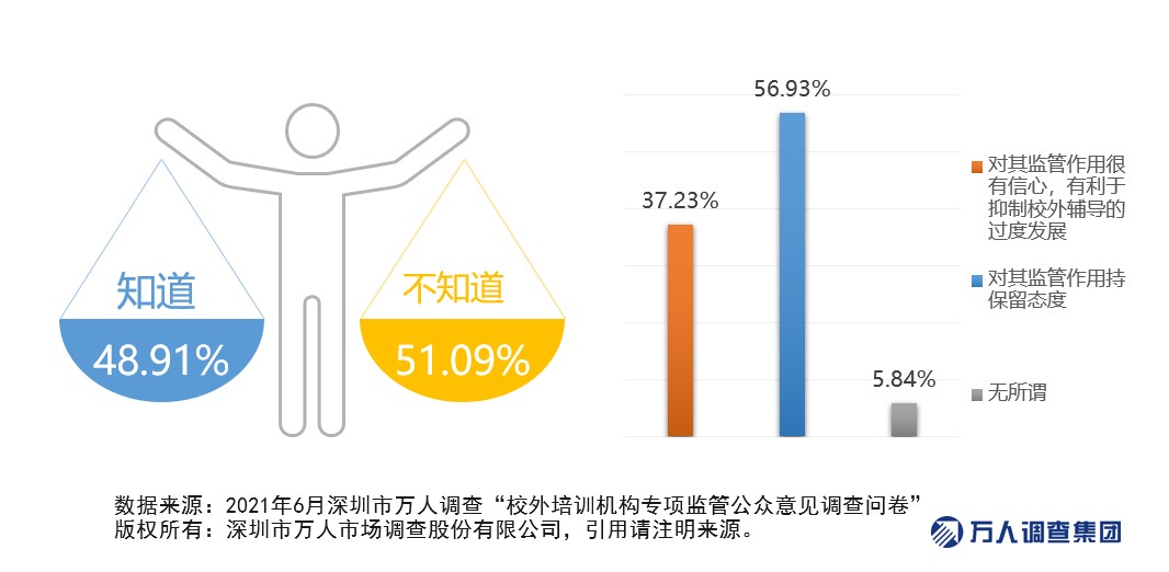 現(xiàn)階段我國“校外培訓(xùn)機構(gòu)”亂象,諸多問題亟待解決。對此,教育部于2021年6月15日成立校外教育培訓(xùn)監(jiān)管司,主要負(fù)責(zé)面向中小學(xué)(含幼兒園兒童)的校外教育培訓(xùn)管理工作。調(diào)查顯示,當(dāng)前新司局的知曉率有近五成,同時有37.23%的市民對其監(jiān)管作用表示很有信心,有利于抑制校外輔導(dǎo)的過度發(fā)展,但也有不少市民持保留態(tài)度。